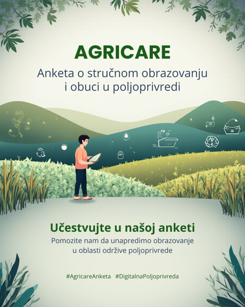 Pozivamo sve nastavnike, trenere, direktore škola i koordinatorе kurikuluma uključene u obrazovanje o poljoprivredi da učestvuju u kratkoj online AGRICARE anketi. Ova anketa je namijenjena pružaocima stručnog obrazovanja i obuke (VET – Vocational Education and Training), odnosno onima koji obrazuju i pripremaju učenike i profesionalce za praktične i profesionalne vještine u poljoprivredi.