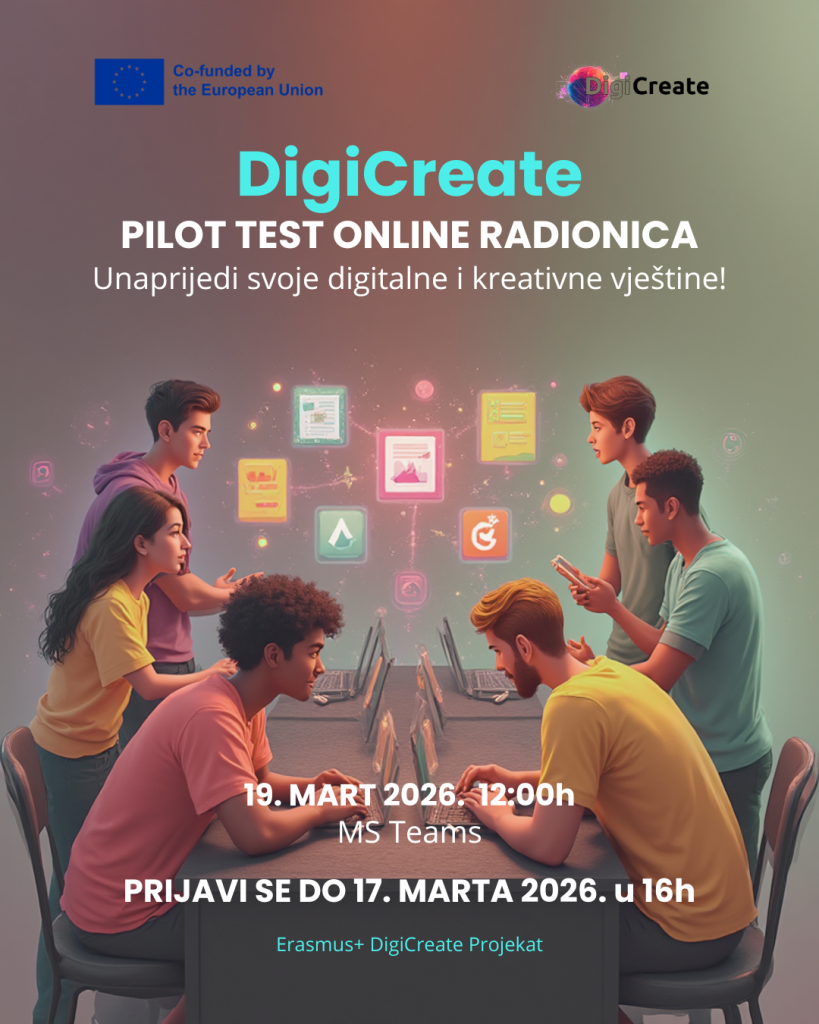 Pozivamo mlade koji su aktivni ili zainteresovani za rad u kulturnim i kreativnim industrijama da učestvuju u DigiCreate pilot test radionici, koja će se održati 19. marta 2026. u 12:00h putem MS Teams platforme.